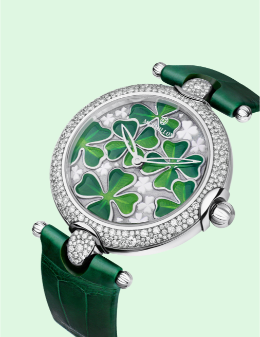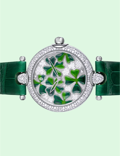 The enamel is paired with mother of pearl, which between them serve to adorn the dial with the delicate leaves that are said to grow in every footstep left by the virtuous Olwen.