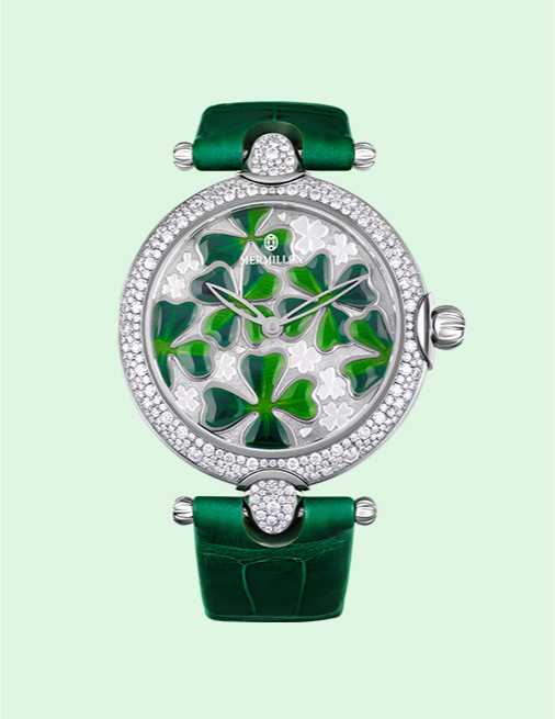 The plants that flourish in Olwen’s wake adorn the dial of this piece, and are hand-painted in enamel, as is a recognizable trait of Mermillon timepieces.